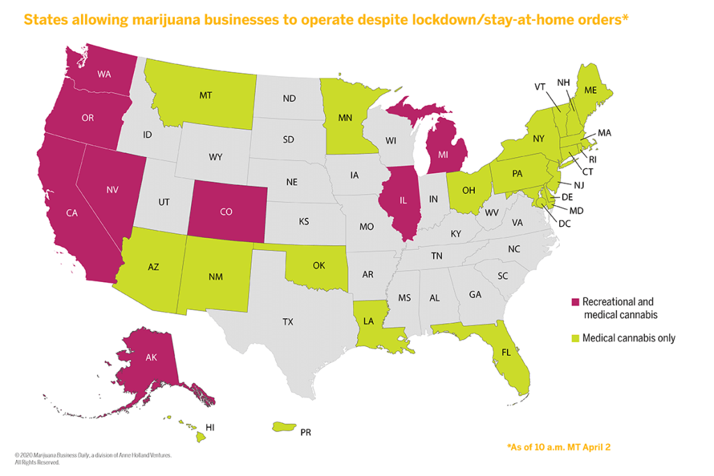 Many states, such as Arizona and Alaska, have not explicitly named cannabis companies in their stay-at-home orders or lists of essential businesses. However, in states legalizing medical marijuana use, cannabis dispensaries remain open — with safety measyres put in of course. For example: