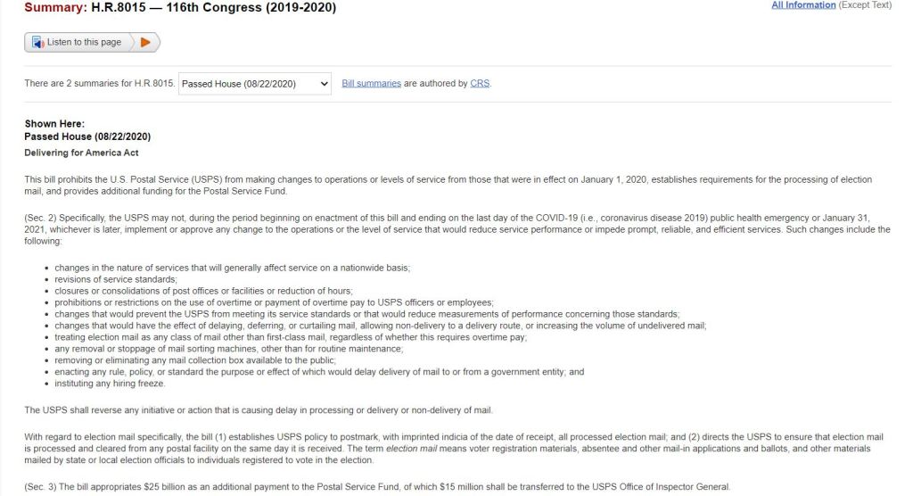 The bill, H.R.8015 – Delivering for America Act, has been met with veto threats from the White House as well as the expectation to not advance through the Republican-controlled Senate.