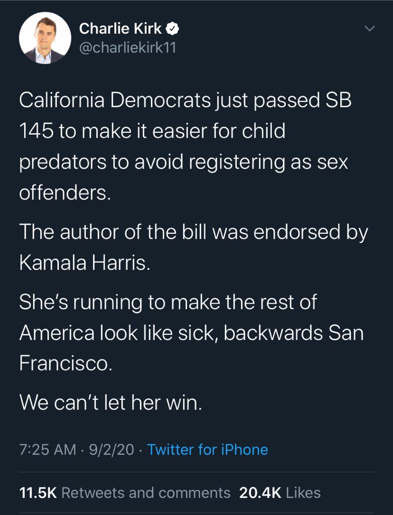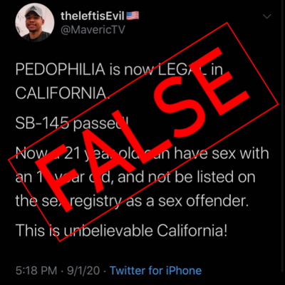 California Governor Gavin Newsom signed into effect SB-145, an amendment to existing state law that gives judges discretion regarding “whether an adult convicted of having vaginal sexual intercourse with a minor should register as a sex offender in cases in which the minor is 14 years or older and the adult is not more than 10 years older than the minor” (Willon, 2020). The bill has been met with controversy surrounding the widespread, yet false, belief that the amendment legalizes pedophilia. Many others have made the claim that the bill is a political tool serving to drive a wedge between Democrat and Republican voters.