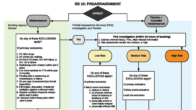 As it relates to the cash bail system, Senate Bill 10 (SB 10), signed into law by Governor Jerry Brown in 2018, sought to eliminate the cash bail system and replace it with risk assessments as determinants of whether a suspect ” should be granted pretrial release and under what conditions. The risk assessments would categorize suspects as low risk, medium risk, or high risk” regarding the risk of failing to appear in court and to public safety.