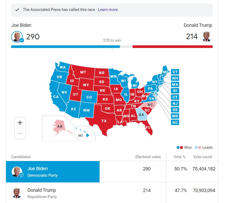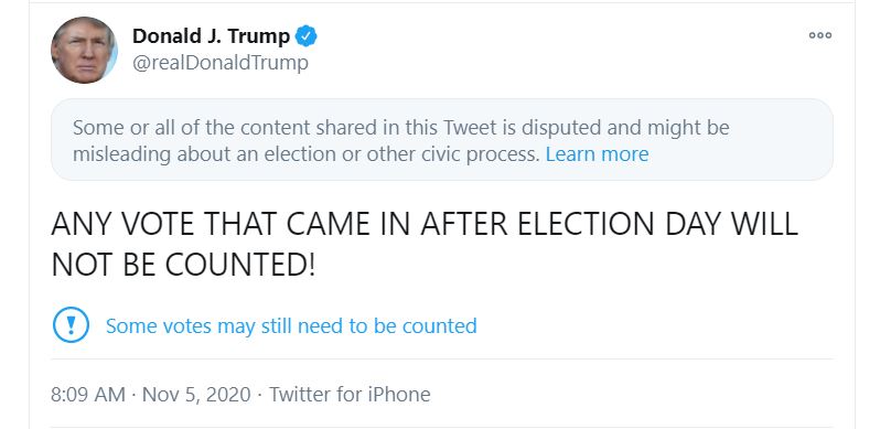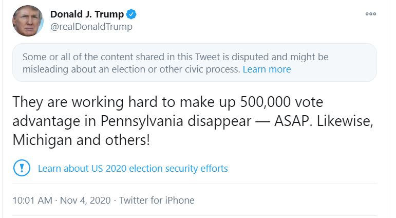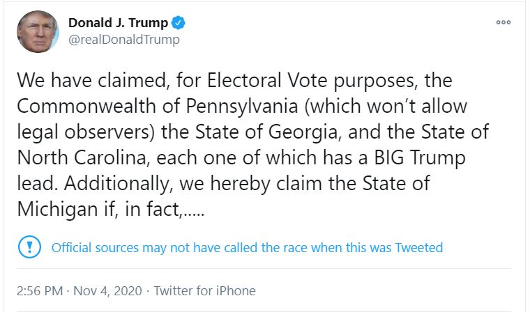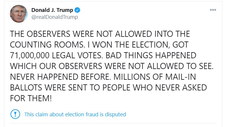 The states sued by the Trump campaign include Georgia, Michigan, and Pennsylvania, all states won by President-elect Biden. Despite the absence of evidence of voter and election fraud, President Trump made and continues to make a multitude of tweets falsely claiming the election, accusing states of making votes disappear, making distinctions between “legal” and “illegal” votes, and demanding that votes (particularly mail-in ballots) stop being counted. President Trump also released a statement rejecting that Biden won the election and declaring that his campaign will “start prosecuting our case in court to ensure election laws are fully upheld and the rightful winner is seated.”