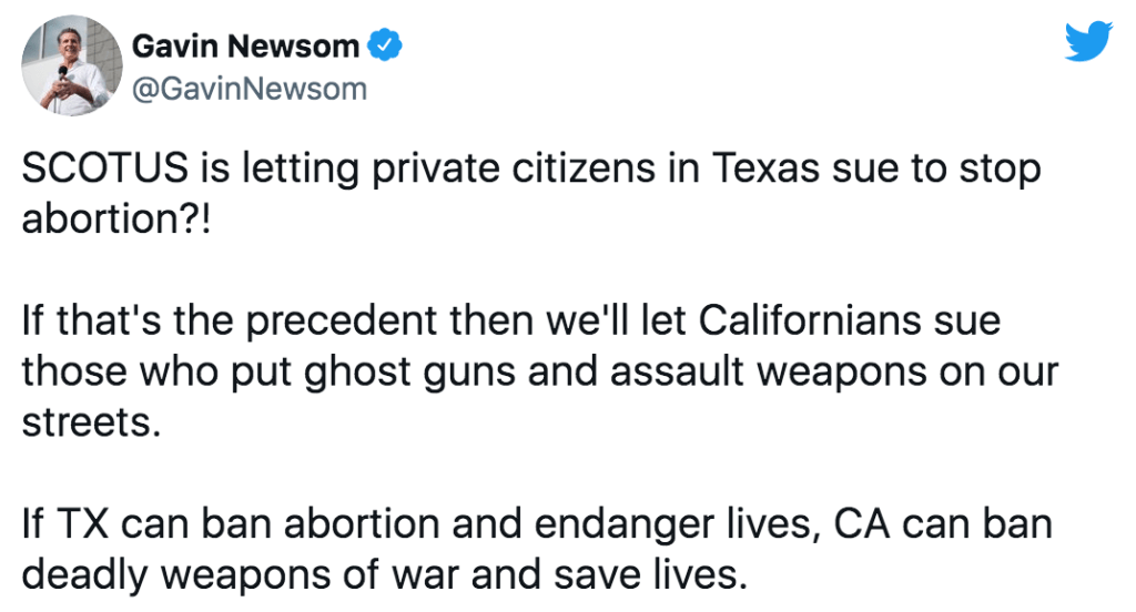 The tactic of the anti abortion bill is the technicality that the state is not enforcing the law, but instead is enforced through private litigation. Governor Newsom plans to use this same tactic to circumvent federal court review over Californians’ second amendment rights. Governor Newsom’s proposal would empower citizens to sue manufactures of assault weapons and “ghost guns” – firearms made from kits – and be awarded at least $10,000 in addition to attorney fees if plaintiffs win their case.
