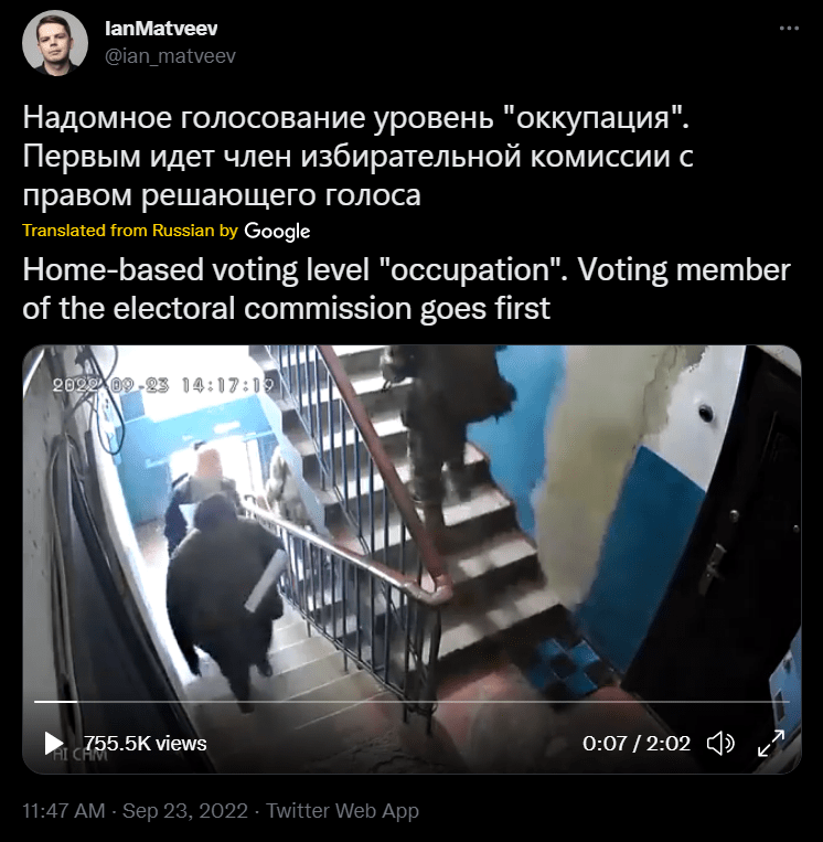 The West also cites the that any vote held under military occupation should be considered fraudulent as the duress of the situation is highly unlikely to produce genuine results resembling the true will of the people. Most often cited is election officials going door-to-door in apartment buildings with soldiers escorting them. Below is an image from an apartment building surveillance camera depicting this.