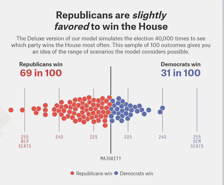 Projections as of October 6th from 538 show Republicans have a 69% chance of taking the House majority, down from its peak at 88% in mid-July. More significantly, their projected majority total is down from 238-197 in mid-June to 225-210.